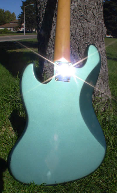 In the classic '60's Fender style it has a groovy custom color, alder body, maple neck & rosewood fingerboard. This bass was made in Japan, apparently in 1997. The weight is 9 pounds, 7.1 ounces.