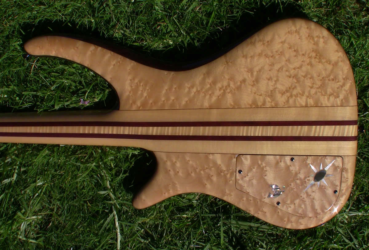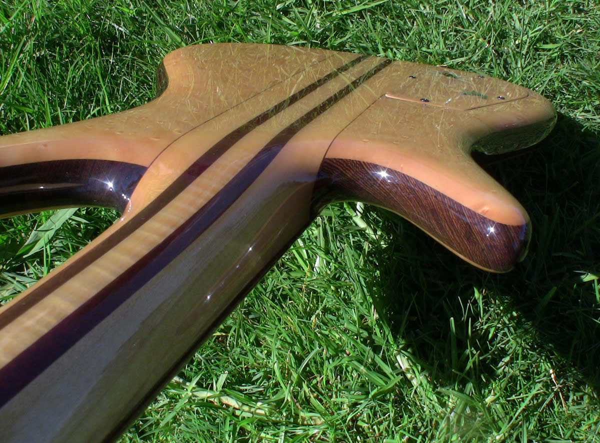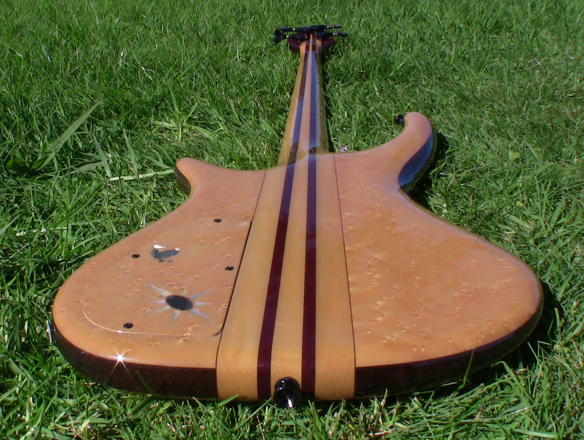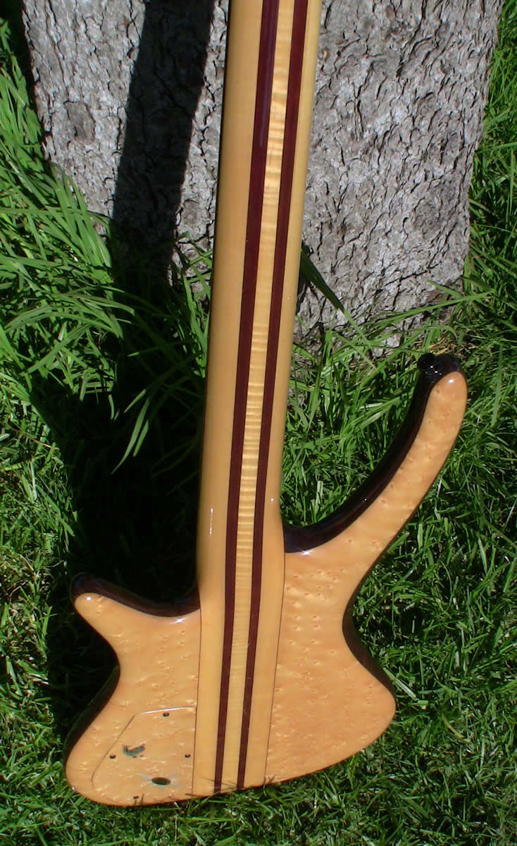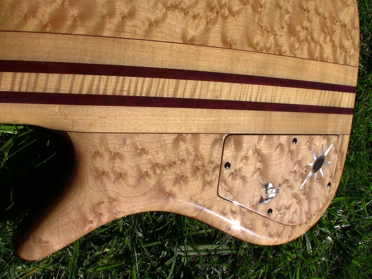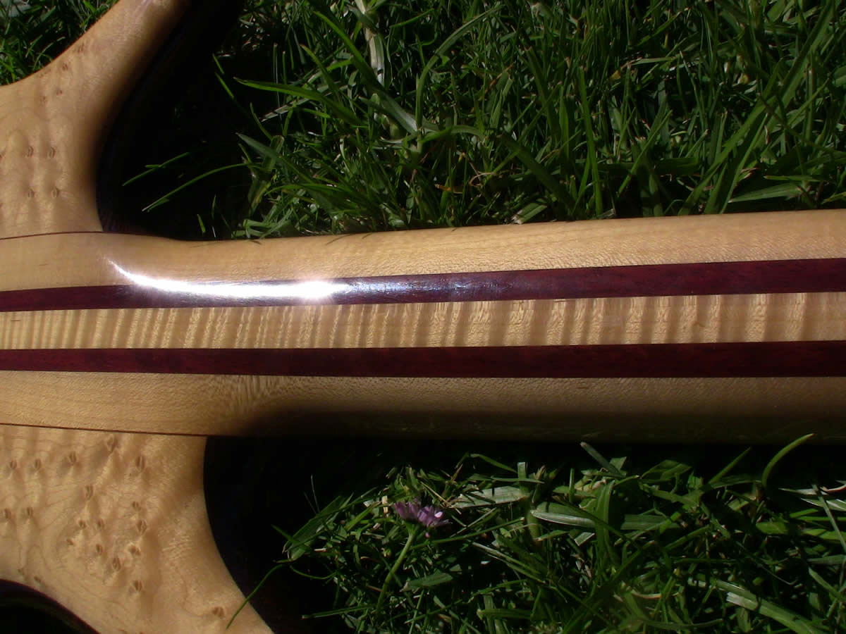 The bass is made with purpleheart, wenge and 3 kinds of maple. The birdseye maple on the body face and back was taken from a pile of wood on it's way to being made into the interior for the Sultan of Brunei's private jet. The 2 pieces of maple on the outsides of the neck is straight maple bought in a store all normal like. The tapered flame maple center strip was part of an old child's bed found in an alley. Good chance it's been peed on more than once. But with such a nice flame it was still worth rescuing from the garbage. The wenge is only in the body core.