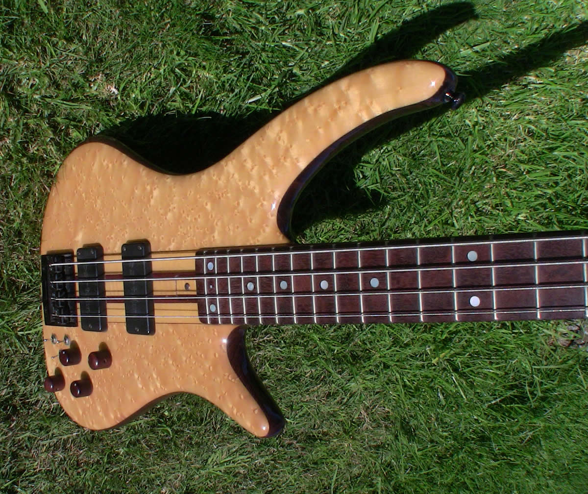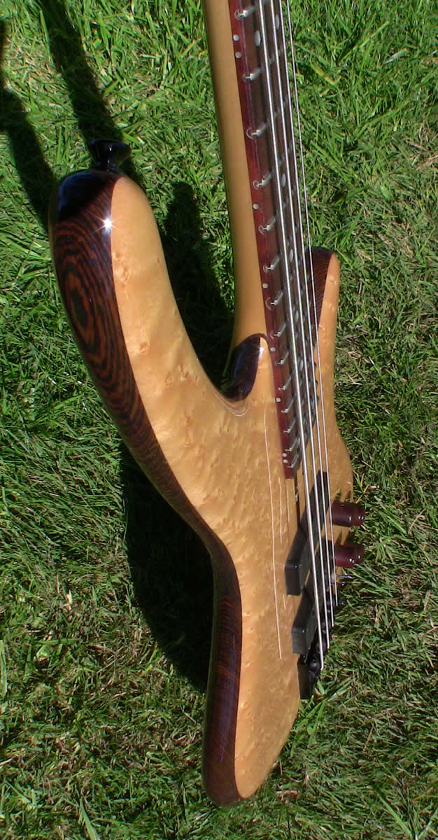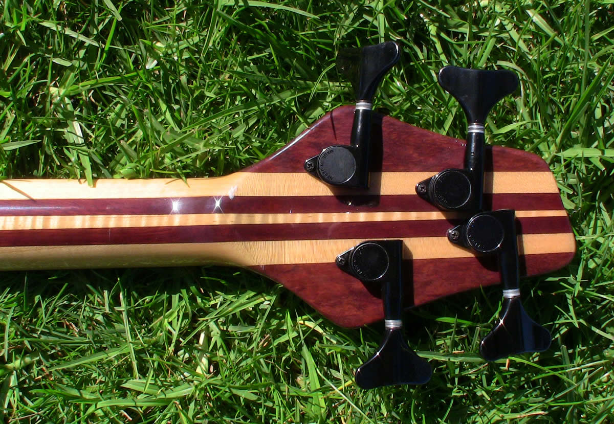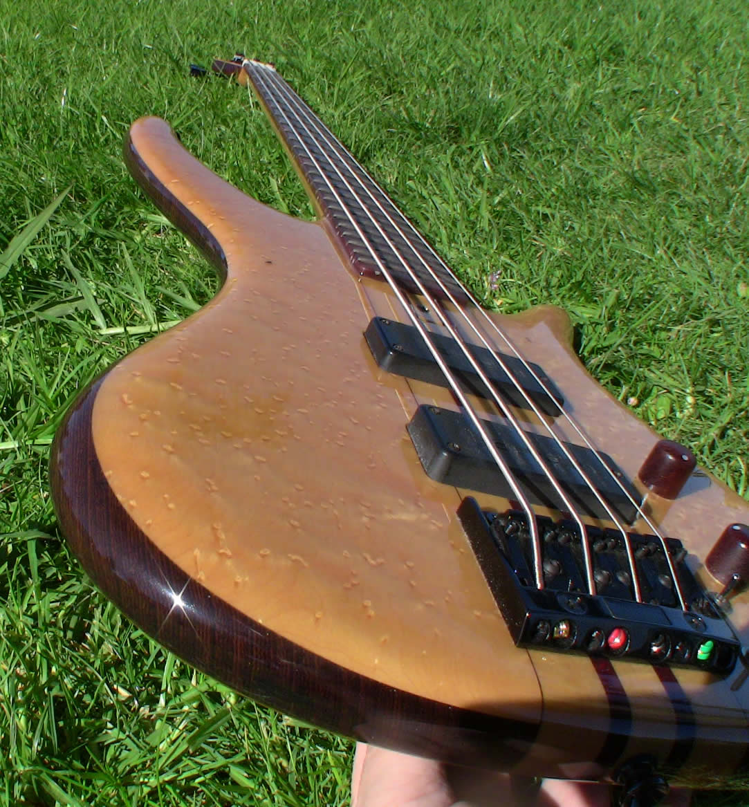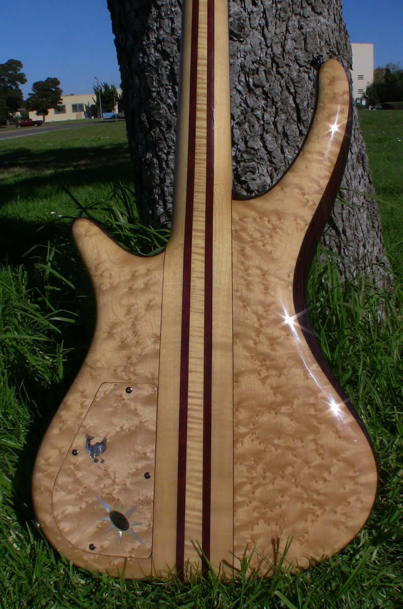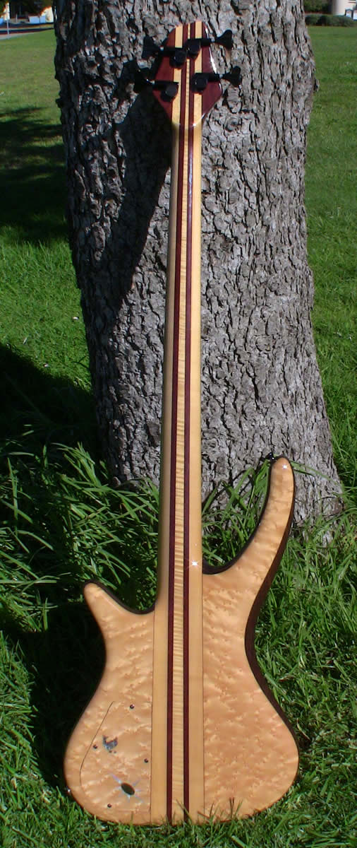 The bass is made with purpleheart, wenge and 3 kinds of maple. The birdseye maple on the body face and back was taken from a pile of wood on it's way to being made into the interior for the Sultan of Brunei's private jet. The 2 pieces of maple on the outsides of the neck is straight maple bought in a store all normal like. The tapered flame maple center strip was part of an old child's bed found in an alley. Good chance it's been peed on more than once. But with such a nice flame it was still worth rescuing from the garbage. The wenge is only in the body core.