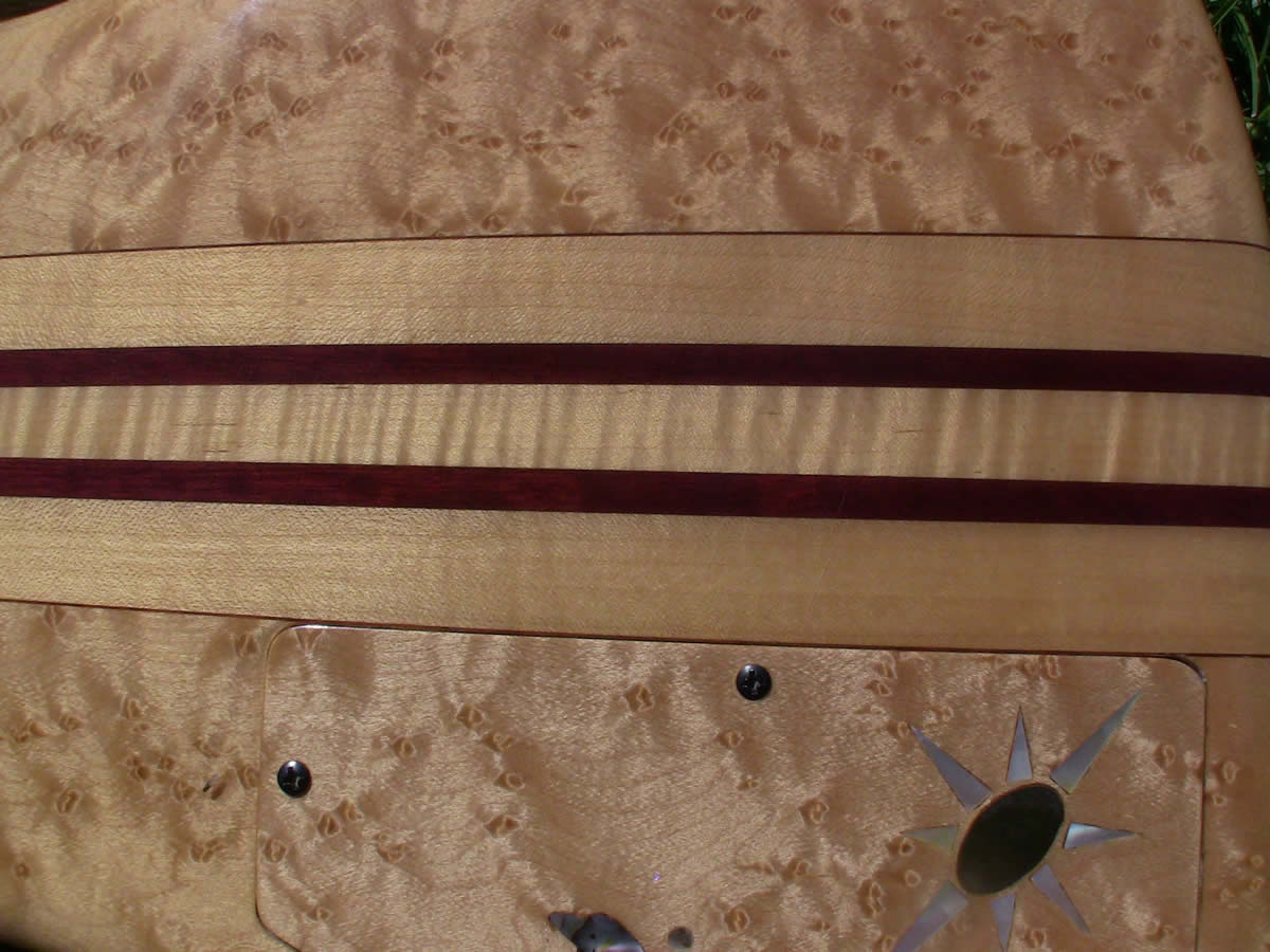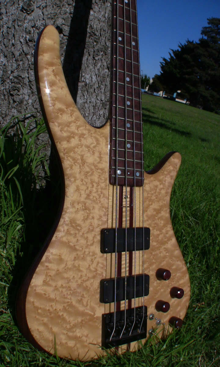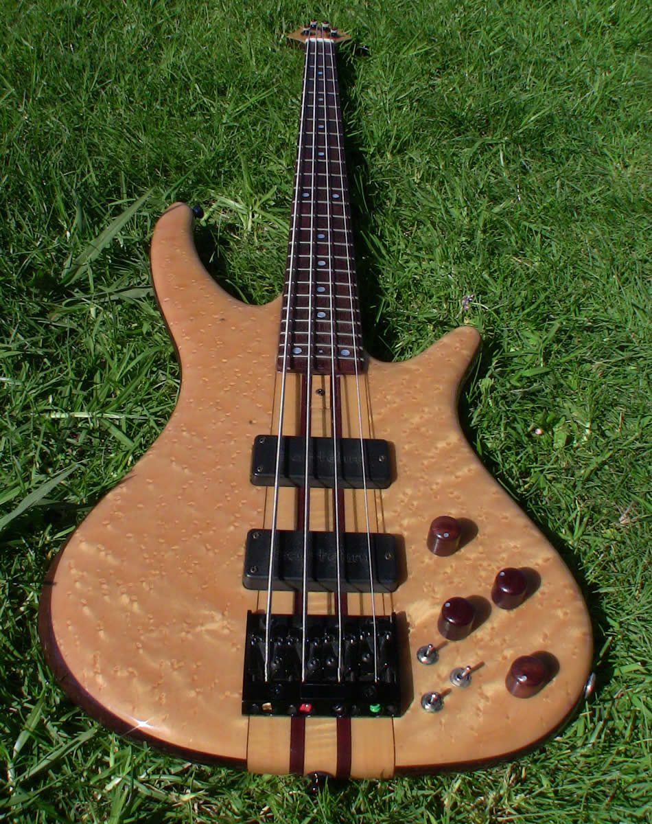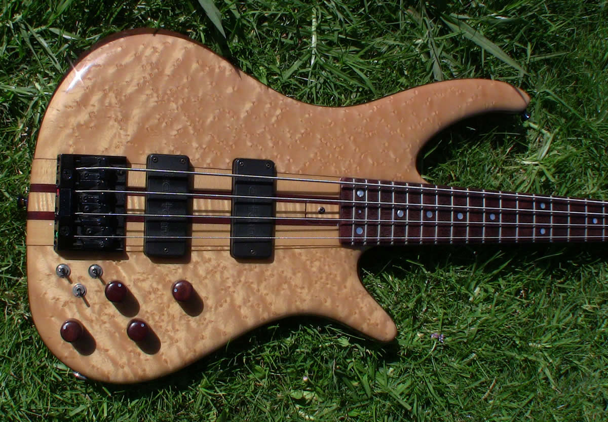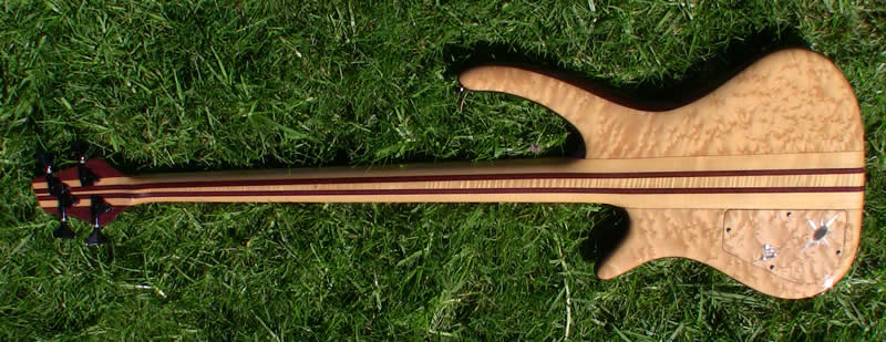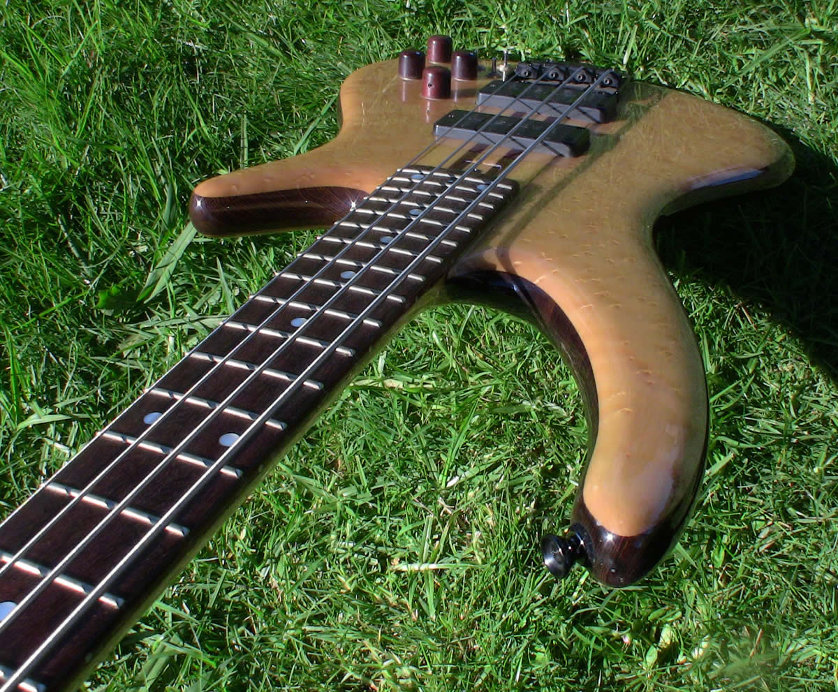 The bass is made with purpleheart, wenge and 3 kinds of maple. The birdseye maple on the body face and back was taken from a pile of wood on it's way to being made into the interior for the Sultan of Brunei's private jet. The 2 pieces of maple on the outsides of the neck is straight maple bought in a store all normal like. The tapered flame maple center strip was part of an old child's bed found in an alley. Good chance it's been peed on more than once. But with such a nice flame it was still worth rescuing from the garbage. The wenge is only in the body core.