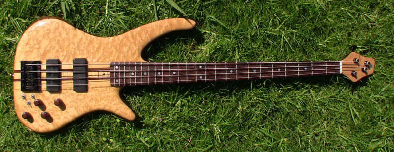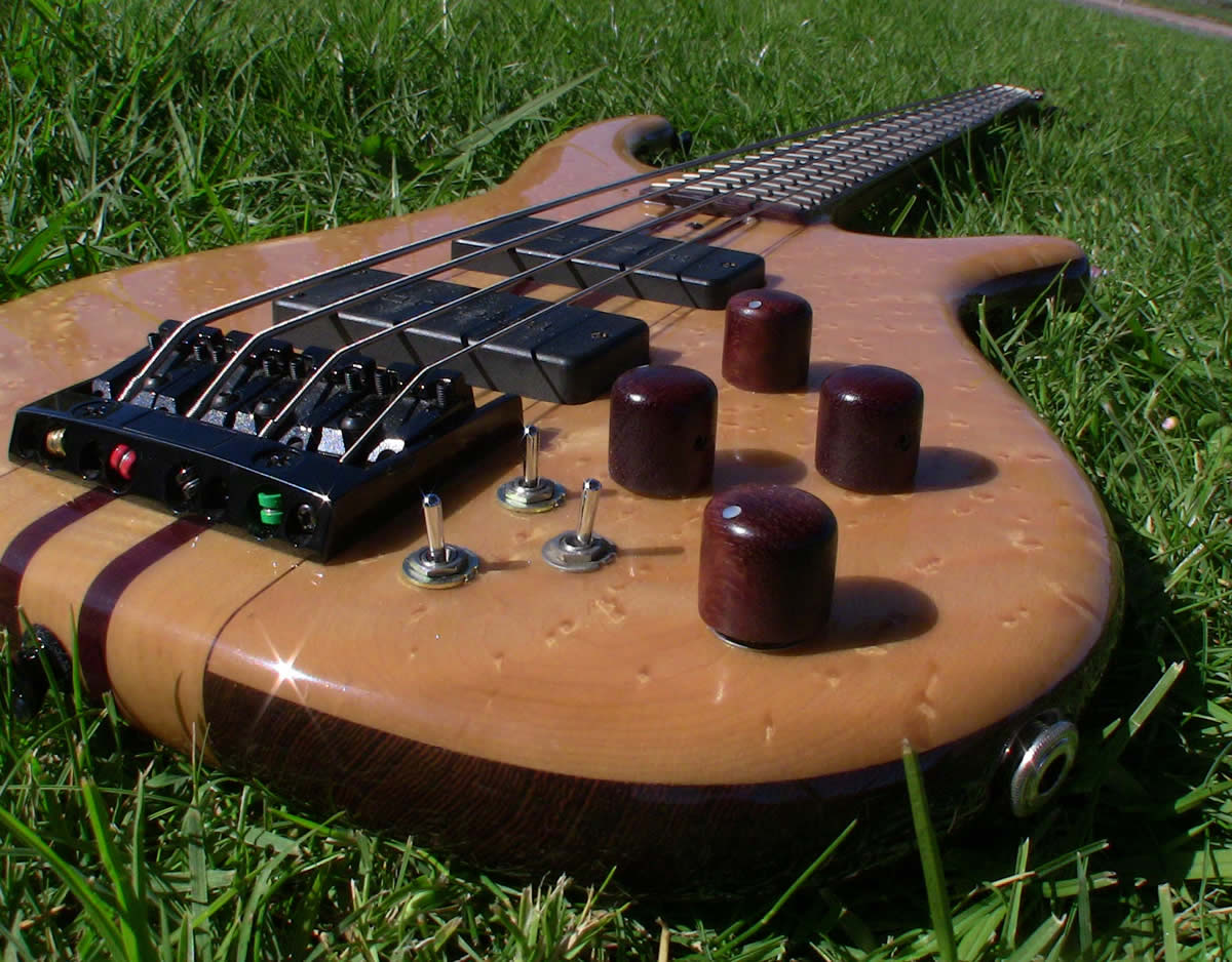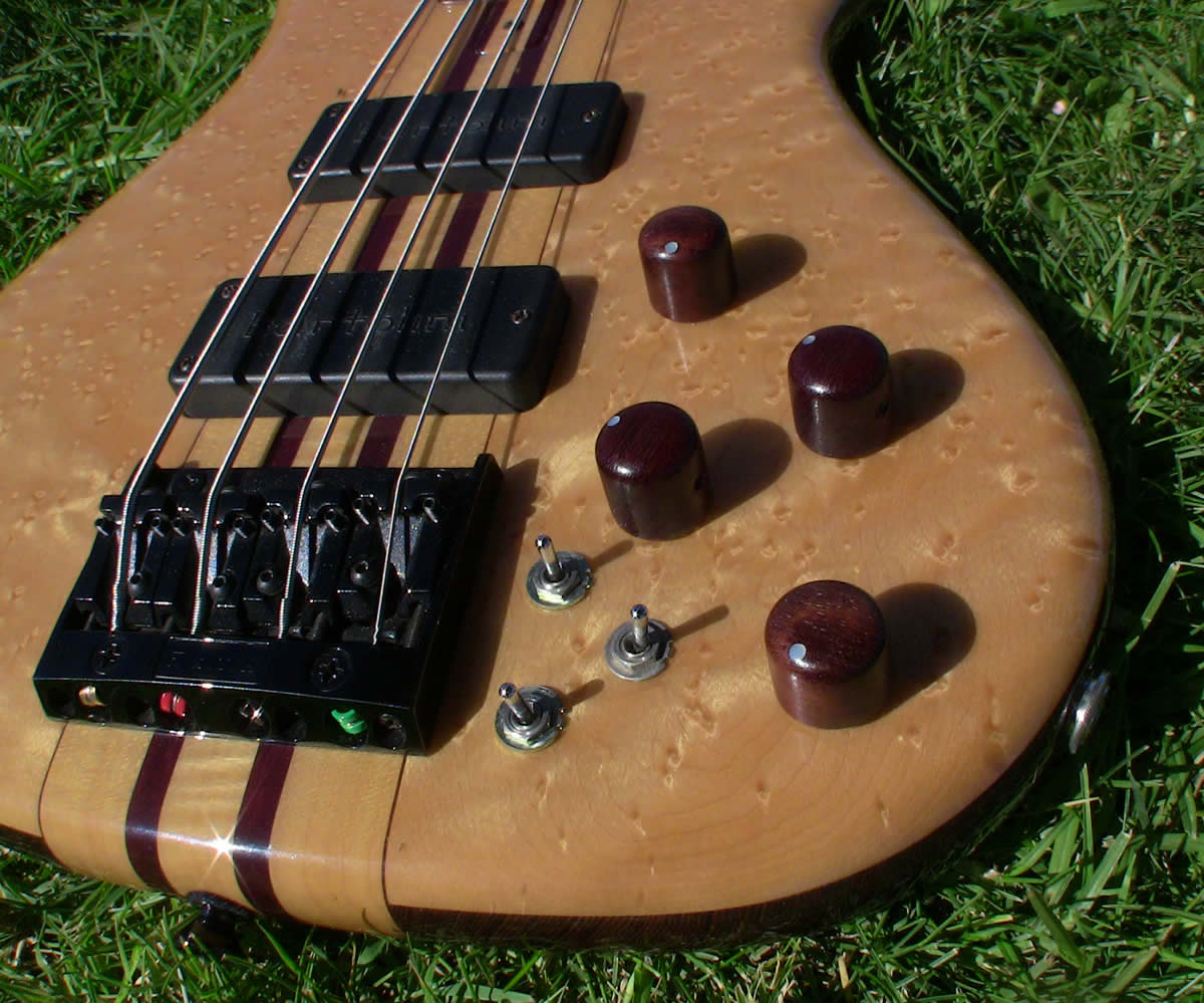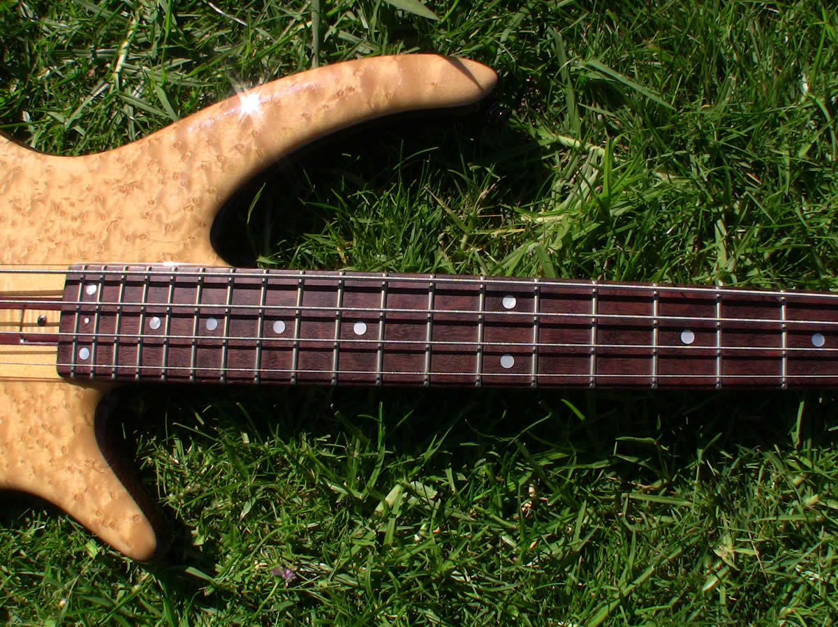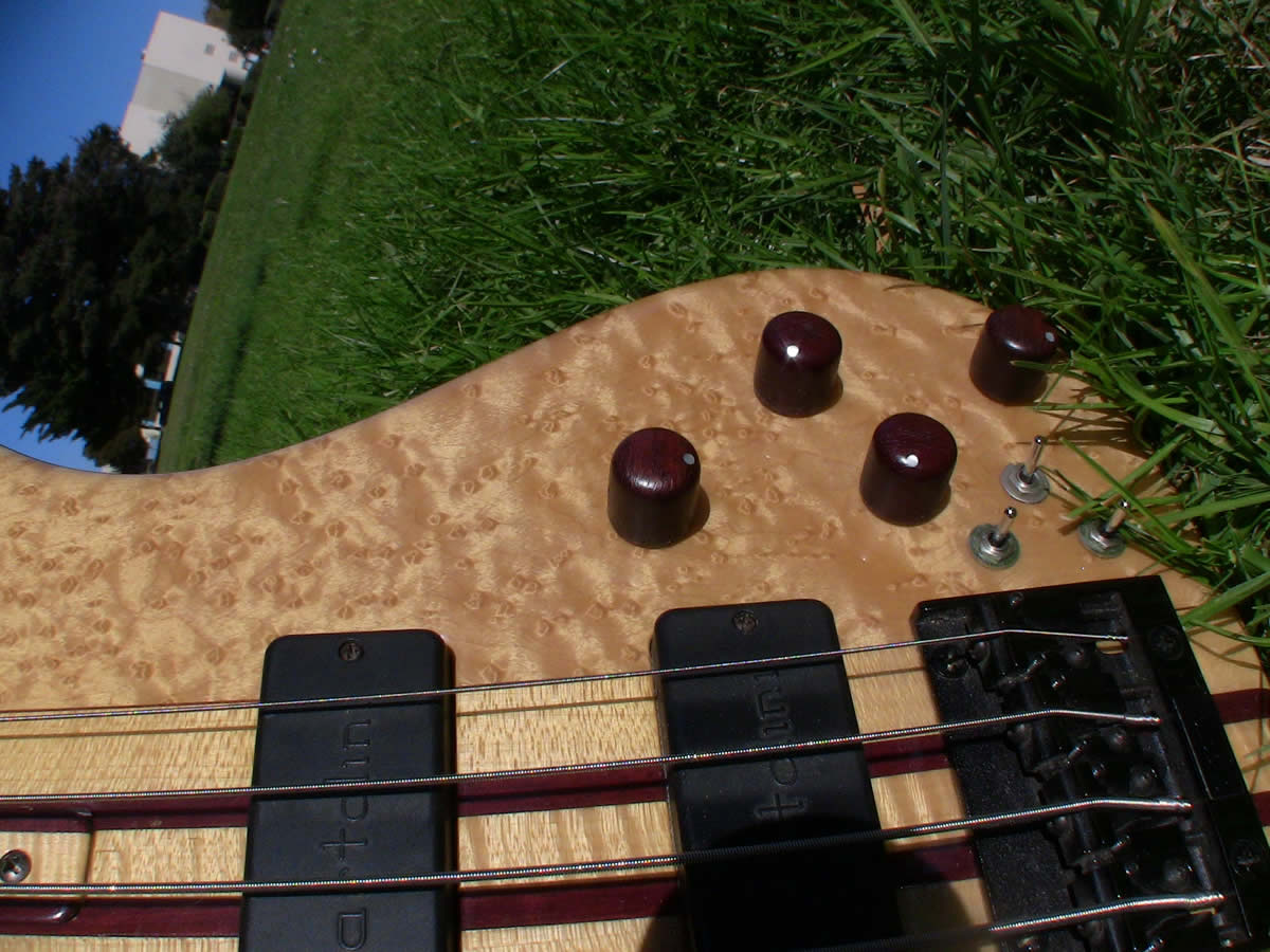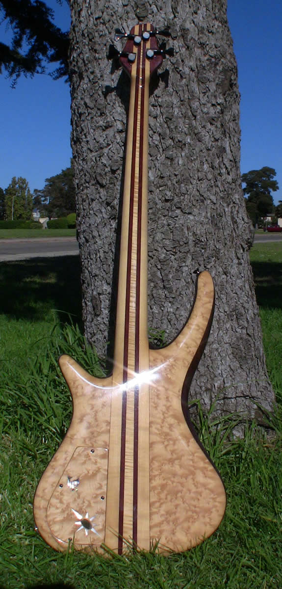 The bass is made with purpleheart, wenge and 3 kinds of maple. The birdseye maple on the body face and back was taken from a pile of wood on it's way to being made into the interior for the Sultan of Brunei's private jet. The 2 pieces of maple on the outsides of the neck is straight maple bought in a store all normal like. The tapered flame maple center strip was part of an old child's bed found in an alley. Good chance it's been peed on more than once. But with such a nice flame it was still worth rescuing from the garbage. The wenge is only in the body core.