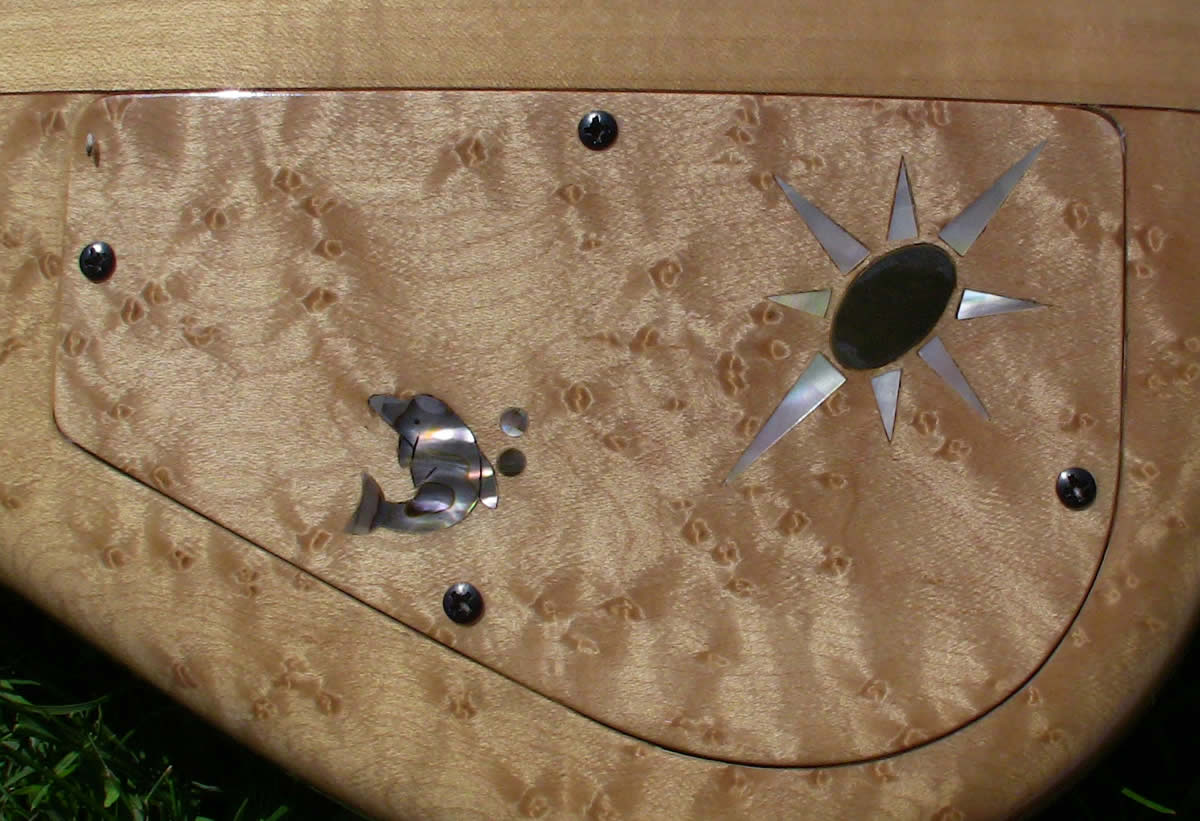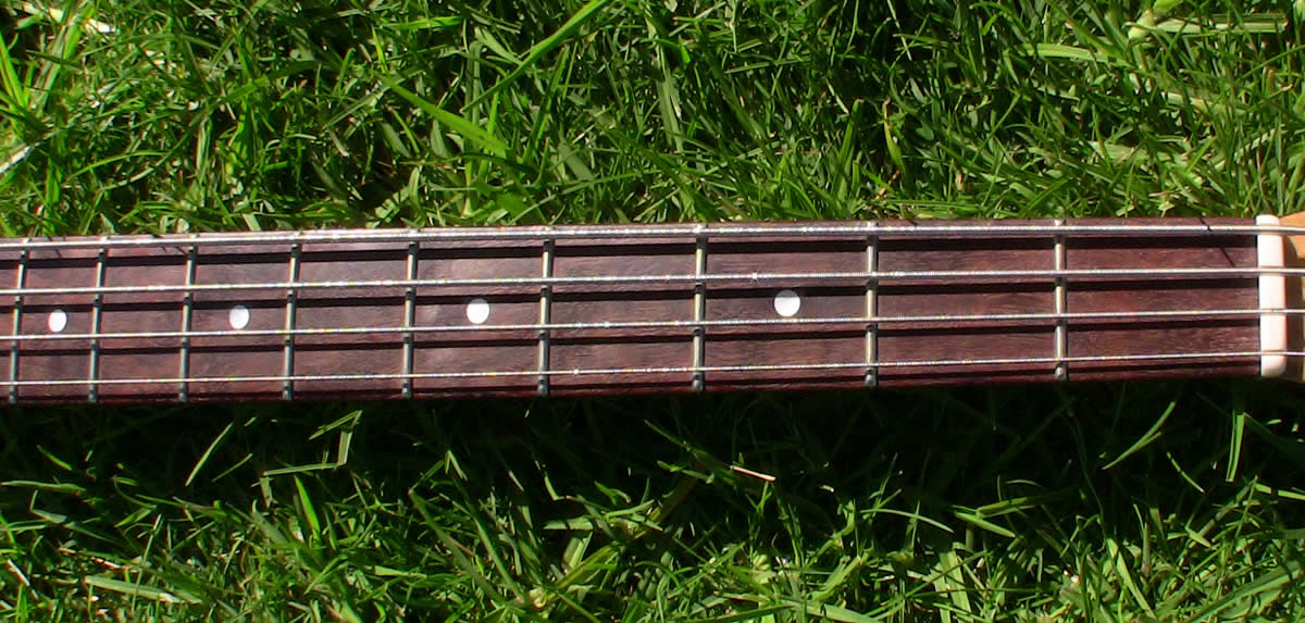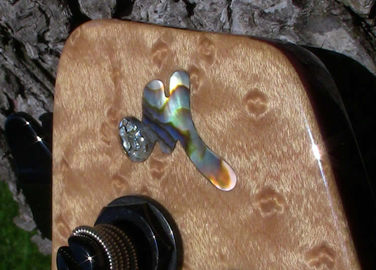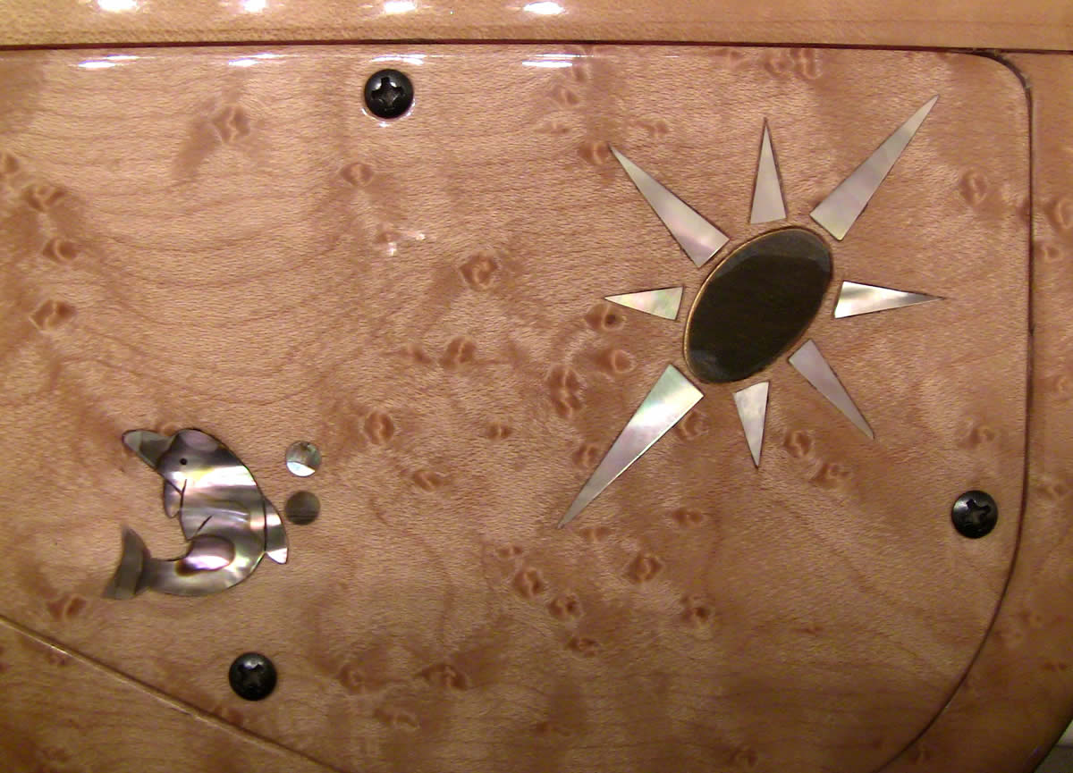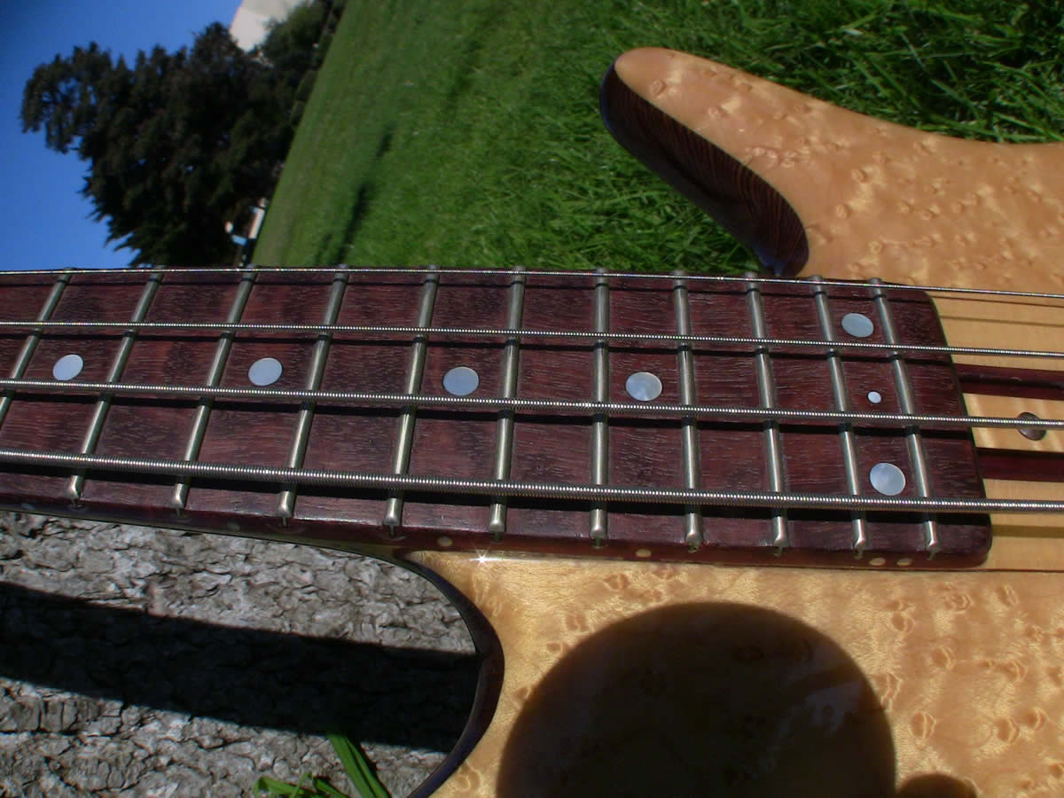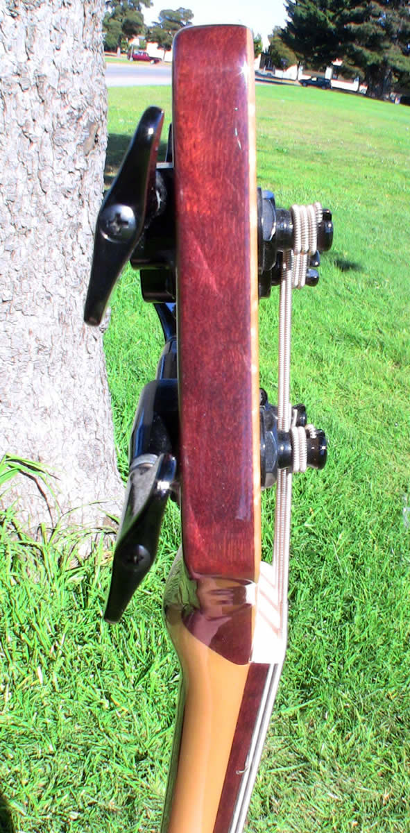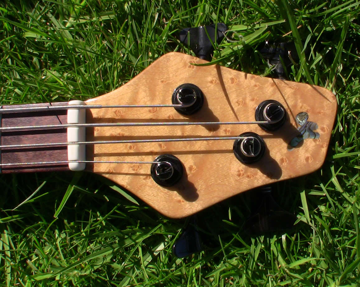The bass is made with purpleheart, wenge and 3 kinds of maple. The birdseye maple on the body face and back was taken from a pile of wood on it's way to being made into the interior for the Sultan of Brunei's private jet. The 2 pieces of maple on the outsides of the neck is straight maple bought in a store all normal like. The tapered flame maple center strip was part of an old child's bed found in an alley. Good chance it's been peed on more than once. But with such a nice flame it was still worth rescuing from the garbage. The wenge is only in the body core.