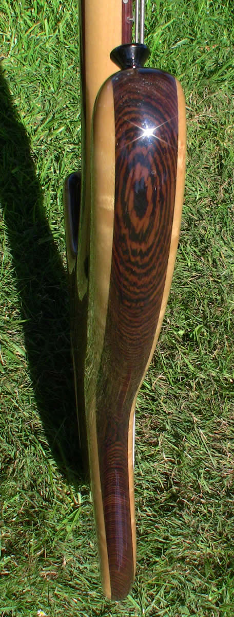 With such dense woods a bass can get very heavy. I kept the body on this, and all my basses, to just 1.25 inches thick which reduces the body weight greatly. This one weighs 9 pounds, 1.2 ounces.